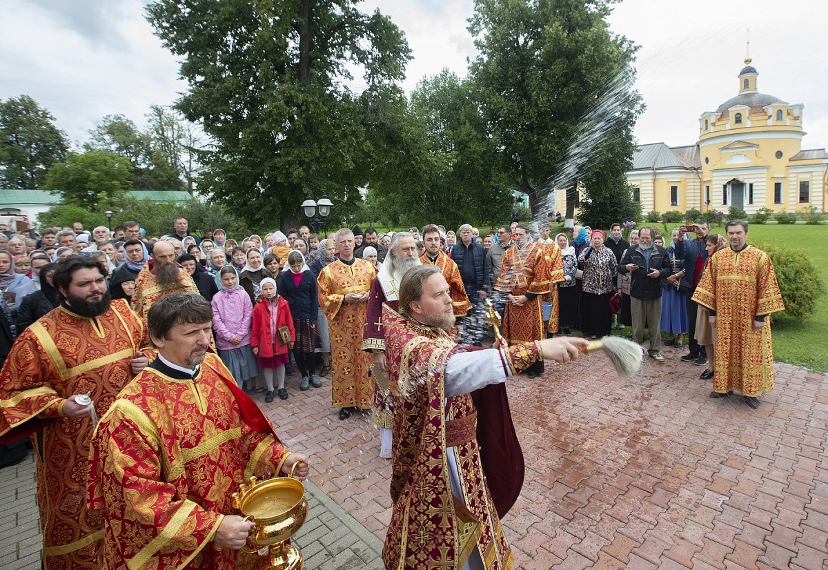 По заамвонной молитве архиепископ Феогност возглавил праздничный крестный ход по территории обители, в ходе которого владыка и священнослужители обители окропили богомольцев святой водой, а по окончании которого вознесли молитву к святым благоверным князьям и страстотерпцем Борису и Глебу.