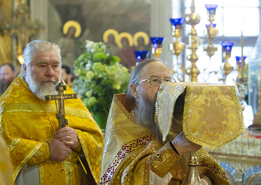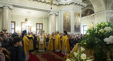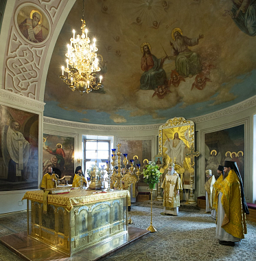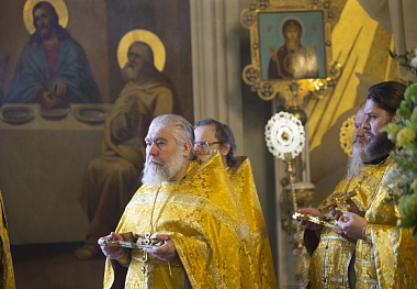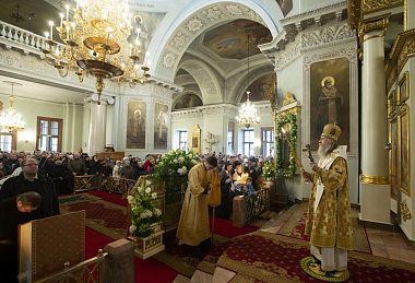 В Троицком соборе обители за Божественной литургией свт. Василия Великого Его Высокопреосвященству сослужили наместник Данилова монастыря архимандрит Алексий (Поликарпов) и братия обители в священном сане.