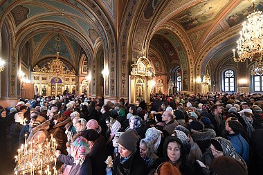 Его Высокопреосвященству сослужили: заместитель председателя Синодального отдела по монастырям и монашеству архимандрит Стефан (Тараканов); протоиерей Владимир Диваков, секретарь Патриарха Московского и всея Руси по г. Москве и клирики обители.