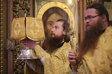 Богослужение возглавил наместник Высоко-Петровского монастыря игумен Петр (Еремеев). Отцу наместнику сослужила братия в священном сане.