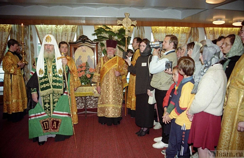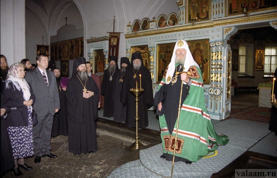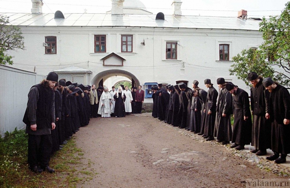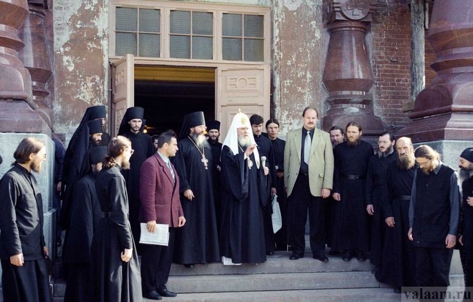 «Визит приснопамятного Патриарха состоялся в августе 1998 года. Не верится, что этим кадрам 20 лет. Видны разруха, порушенные стены – целая эпоха прошла. Это сейчас Святейшего Патриарха на Валааме встречает сотня монахов, а на этих кадрах мы видим десяток насельников, из которых половина – трудники. А самым подобающим транспортом была обыкновенная конная бричка – другого достойного транспорта для Первостоятеля на монашеском острове просто не нашлось.