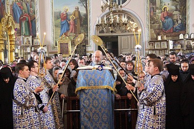 Накануне, 19 марта, вечернее богослужение с литией и пением акафиста перед чудотворным образом Божией Матери «Споручница грешных» возглавил митрополит Вышгородский и Чернобыльский Павел, наместник Свято-Успенской Киево-Печерской лавры.