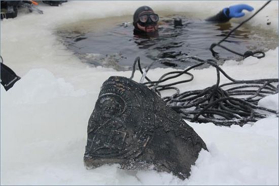 24 февраля были найдены остатки фундамента и первого яруса храма Преображения Господня. Водолазы также нашли следы двух алтарей и фрагмент колокола с изображением святителя Николая Чудотворца.