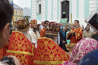 По окончании Литургии на Соборной площади возле Надкладезной часовни состоялся молебен с водосвятием, который отслужили владыка Андрей с братией обители.