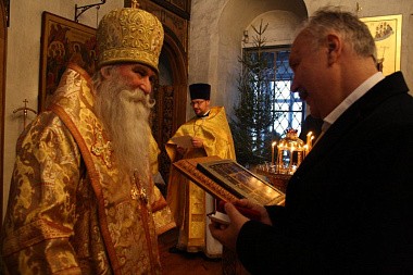 Преосвященный Владыка поздравил с 75-летием духовника обители иеромонаха Георгия (Мысовского), а также поздравил с праздником Рождества Христова присутствовавшие на богослужении семьи священнослужителей и вручил супругам клириков букеты цветов, а детям сладкие рождественские подарки.