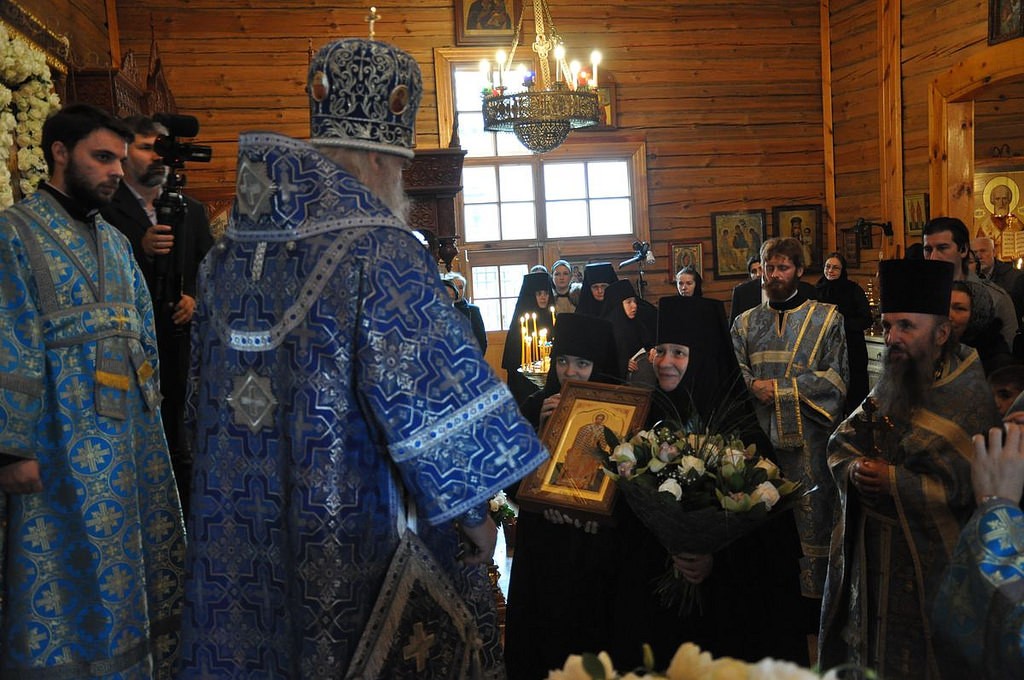 На память о сем высокоторжественном дне настоятельница обители вручила владыке Феофилакту икону святого праведного Лазаря, епископа Китийского, большая частица мощей которого имеется в Богородице-Рождественском соборе монастыря, и букет цветов.