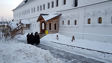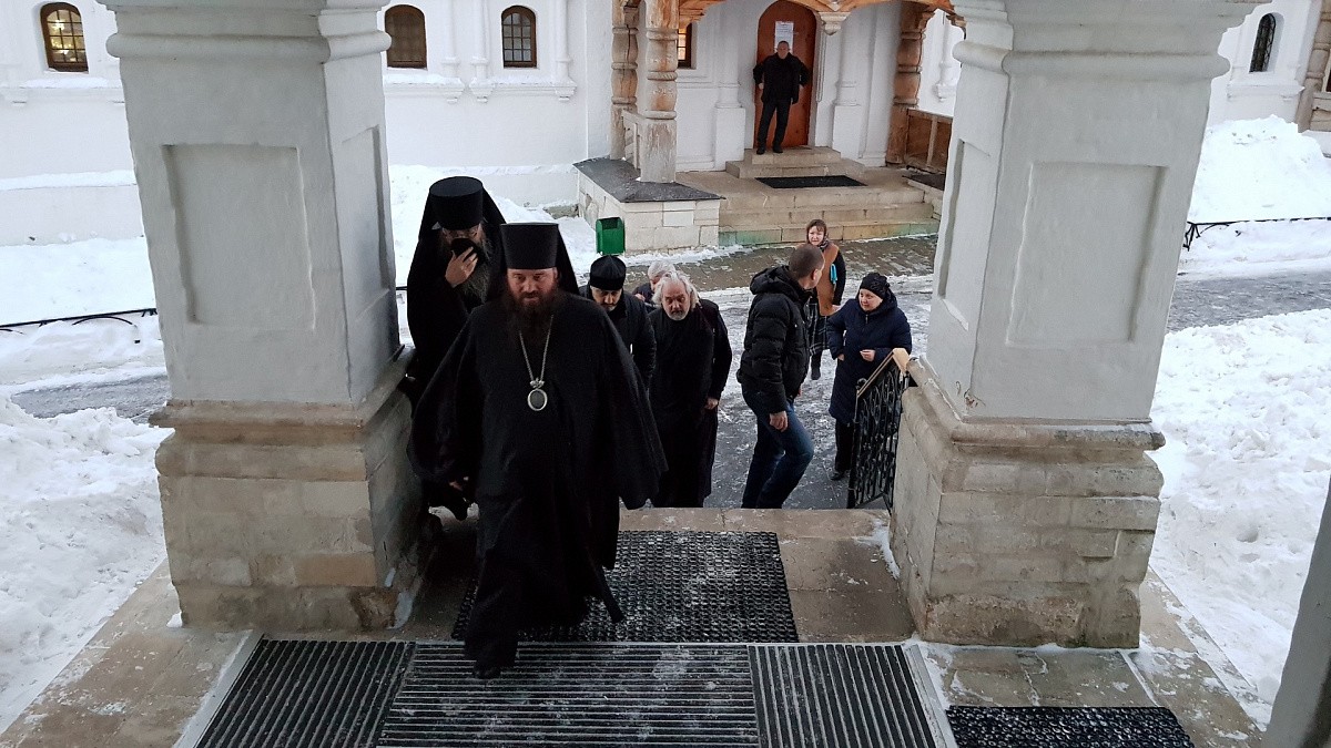 Наместник Саввино-Сторожевского монастыря архимандрит Савва (Фатеев) с братией встретили Преосвященного владыку у собора Рождества Божией Матери, где Его Преосвященство поклонился мощам основателя обители прп. Саввы Сторожевского.