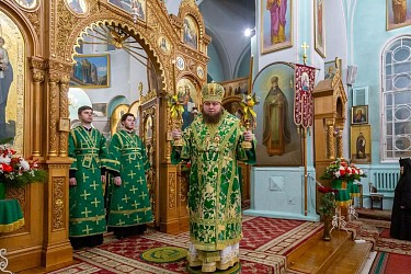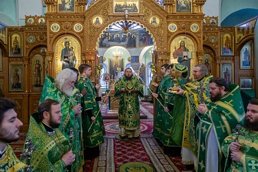 За Литургией Его Преосвященству сослужили клирики монастыря, Духовной академии и других храмов.
