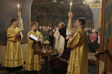 Его Преосвященству сослужили настоятель подворья игумен Серафим (Симонов) и игумен Владимир (Мельников).