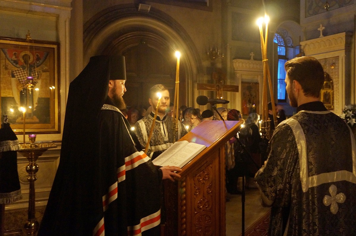 20 февраля 2018 года, во вторник первой седмицы Великого поста, уставное вечернее богослужение в храме Всех святых Алексеевского ставропигиального женского монастыря возглавил викарий Святейшего Патриарха Московского и всея Руси епископ Люберецкий Серафим, председатель Синодального отдела по делам молодежи.