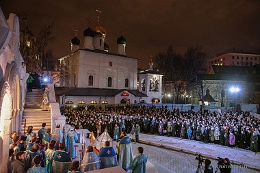 Наверное, это неслучайно. Первая служба здесь, в Сретенском монастыре, на Сретение Господне 1994 года произошла тоже на улице, мы помним это. И первая служба перед новым храмом не нарочито, а вот так само собой получилось, происходит тоже под открытым небом в великом храме мира Божия, в котором все мы живем.