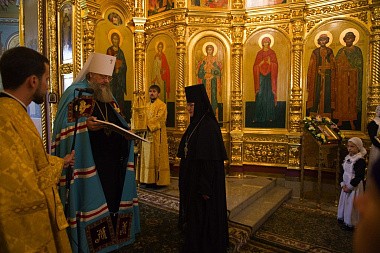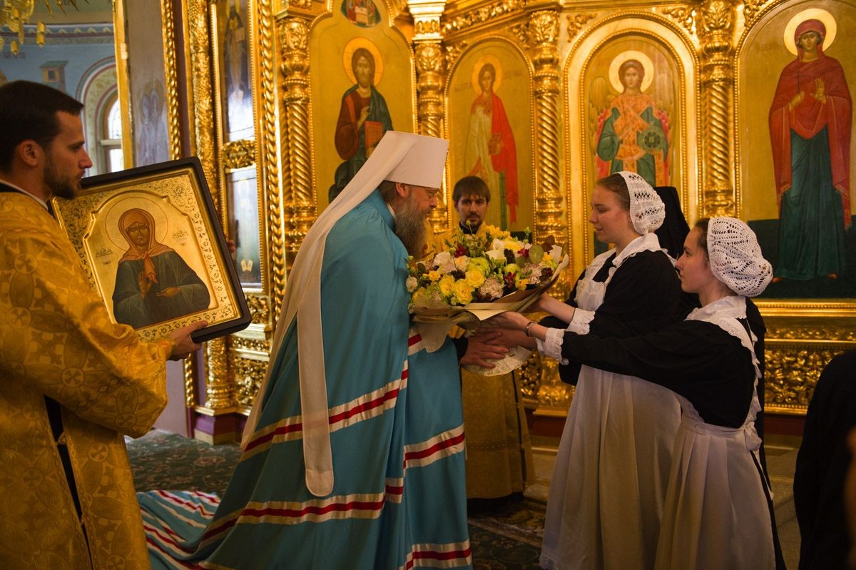 Поэтому слово мое прежде всего к Вам Досточтимая Матушка, а так же наставникам и учителям, всем тем, кто помогает Вам воспитывать в этой гимназии детей. Слово благодарности с низким поклоном и с пожеланием огромной помощи Божией. И конечно, в этом процессе воспитания, духовного созидания личности, должны участвовать не только учителя и ученики. Обязательно в этом процессе должны участвовать родители, потому что если ребенок приходит из гимназии и видит совсем не то, что ему преподавали в школе и сталкивается с неправильным миром восприятия и устройства в своей собственной семье, то, конечно, его жизненный опыт и восприятие этого мира искажается, происходит надлом в душе маленького человека, который долго не заживает, а если заживает, то оставляет после себя рубцы, которые очень тяжело врачуются в душе. Иногда эти раны, несоответствия в семейной, общественной, школьной жизни, духовной жизни печальным опытом могут отозваться в дальнейшей его судьбе. Поэтому обращаюсь сегодня, благодарю Матушку игумению, педагогов за воспитание, и конечно же я обращаюсь к родителям и прошу вас быть верными и мудрыми помощниками в воспитании ваших собственных детей, за которых вы, прежде всего, и несете ответственность перед Богом. Я хотел бы поблагодарить пастырей, которые совершают свое служение здесь в гимназии, духовно назидая, учеников и воспитанников, научая их Закону Божиему, прививая им любовь к Богослужению и Таинствам Святой Церкви.