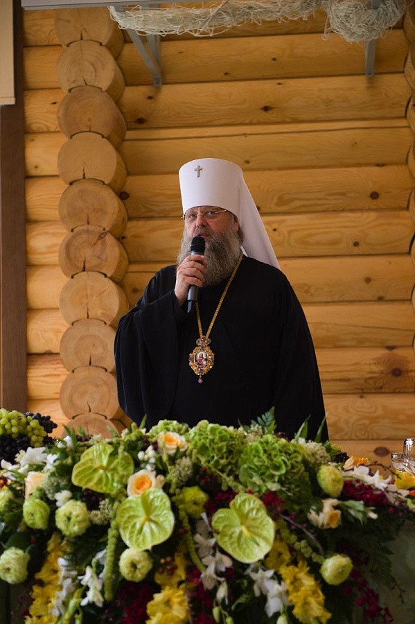 Я всех вас приветствую с 20-летием замечательной гимназии, молитвами желаю помощи Божией. благодатного Покрова Царицы Небесной, всем тем кто участвует в этом великом важном деле домостроительства человеческой души и воспитании. И конечно не могу не обратить особое слово Матушке игумении, которая столько трудов, сил и внимания прилагает этому процессу. Казалось бы монашествующие призванные к тому, чтобы уйти от этого мира в глубь своей келии и там совершать свое служение. Но отрекшись от мира, служить этому миру, и есть, подлинное призвание каждого монашествующего. Поэтому, дорогая Матушка, примите от меня лично, как от человека, который вас хорошо и давно знает, а так же как от человека, который исполняет председательские обязанности в Синодальном отделе религиозного образования и катехизации мою сердечную любовь, почтение, благодарность. И сегодня, в день 20-летия гимназии я хотел бы вручить вам благословенную грамоту. Пусть она служит напоминанием о нашей сегодняшней молитве, о нашей встрече, о тех трудах которые вы несете и символизирует неизменное почтение и благословение вашим трудам.»