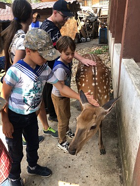 Насельники подворья пригласили гостей на трапезу, где все могли продегустировать монастырскую продукцию. Ребята устроили концерт, в рамках которого прозвучали патриотические песни. Был спет и гимн ушаковцев: «Мы ушаковцы – Родины оплот». Далее отец Сергий постарался для ребят устроить настоящий праздник и преподнес подарок – посещение оленьей фермы, которая располагается в непосредственной близости от подворья в Сумарокове.