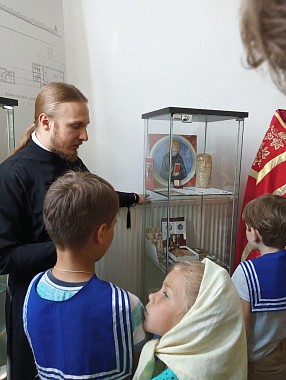 В Иоанно-Предтеченском храме перед частицей святых мощей Крестителя Господня Иоанна был совершен молебен. Затем дети и их наставники в лице председателей Центра духовно-патриотического служения Отечеству имени святого праведного воина Федора Ушакова С.И. Катькало и М.В. Ганичевой познакомились с жизнью подворья, его святынями. О подворье, его истории и истории храмов было рассказано с помощью небольшой музейной экспозиции, в которой представлены не только прошлое, но и будущее этого места. Всех ушаковцев восхитила деревянная церковь в честь иконы Божией Матери «Неувядаемый цвет».