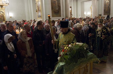 Отслужив вечерню и литию, за утреней по прочтении Евангелия и исполнения величания празднуемому святому во время чтения канонов благоверного князя Даниила Московского владыка Арсений совершил помазание елеем молящихся в храме.
