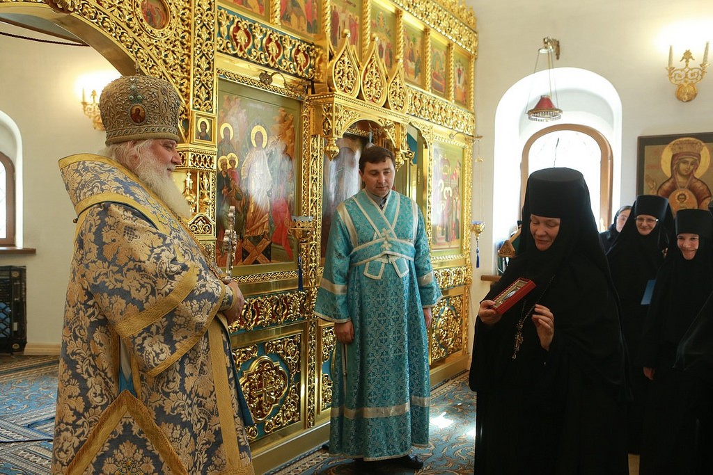 По окончании богослужения игумения Иулиания выразила благодарность Высокопреосвященнейшему владыке за вознесенные молитвы, преподнесла цветы и памятный подарок: декоративное панно с изображением Надвратного храма монастыря и четки.