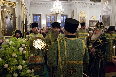 Отслужив вечерню и литию, за утреней по прочтении Евангелия и исполнения величания празднуемому святому во время чтения канонов владыка Арсений совершил помазание елеем молящихся в храме.