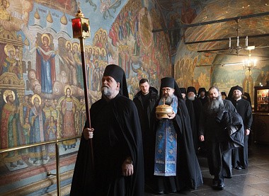 Его Высокопреосвященству сослужили братия монастыря в священном сане.