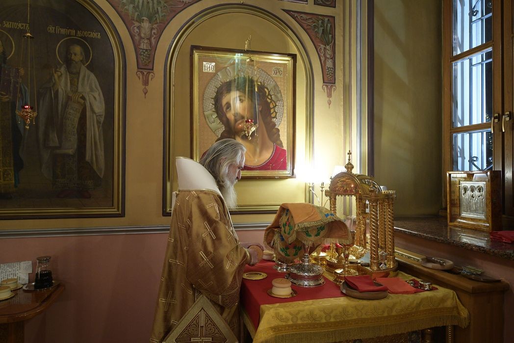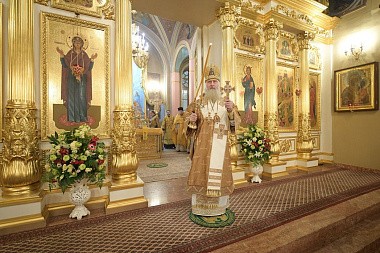 За Божественной литургией в соборе Воскресения Словущего Его Высокопреосвященству сослужили клирики обители.