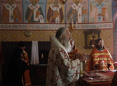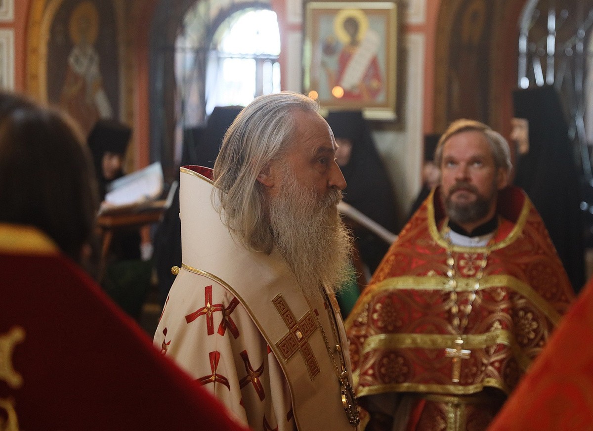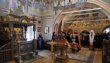 Богослужение состоялось во вновь открытом после завершения росписи стен и ремонтных работ Стефановском храме обители.