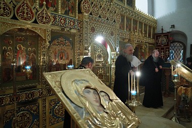 За богослужением молились заместитель председателя Синодального отдела по монастырям и монашеству, настоятельница Зачатьевского ставропигиального женского монастыря игумения Иулиания (Каледа) с сестрами, настоятельница Богородице-Рождественского ставропигиального женского монастыря игумения Викторина (Перминова).