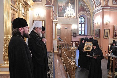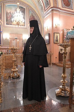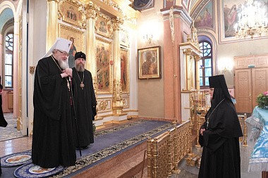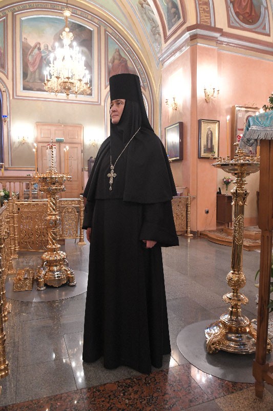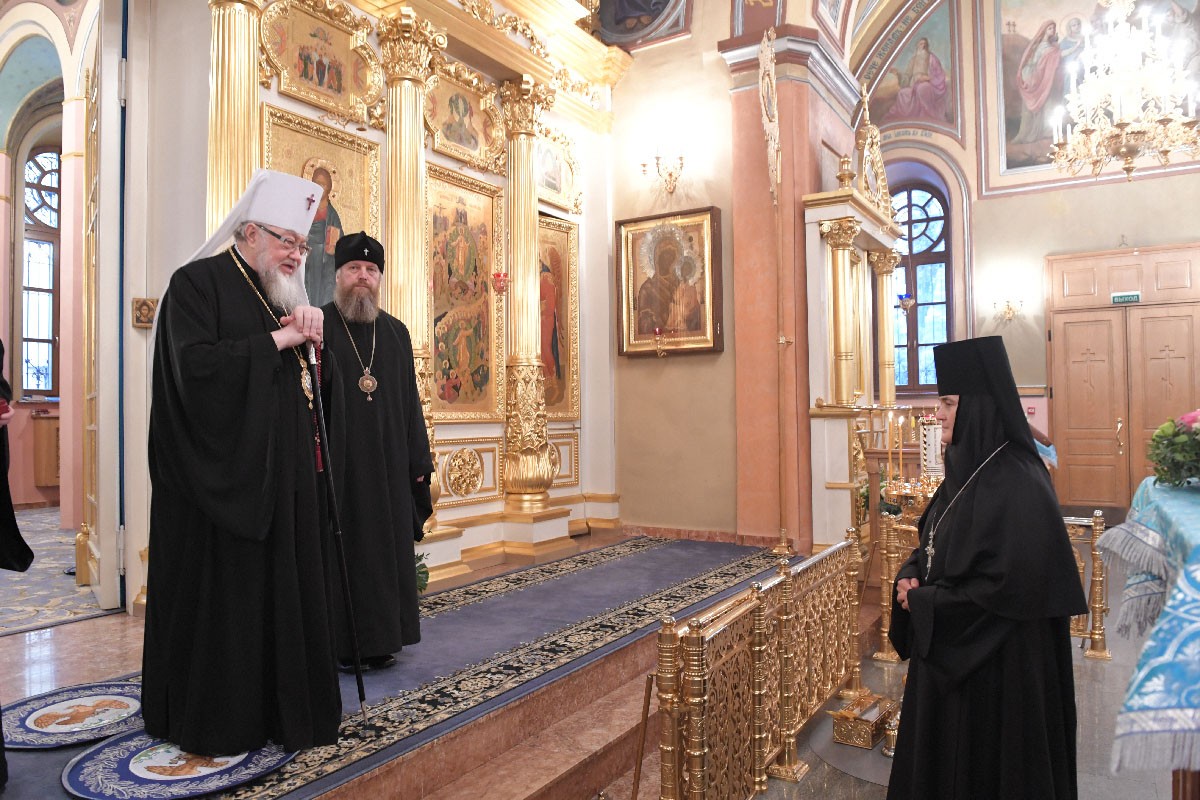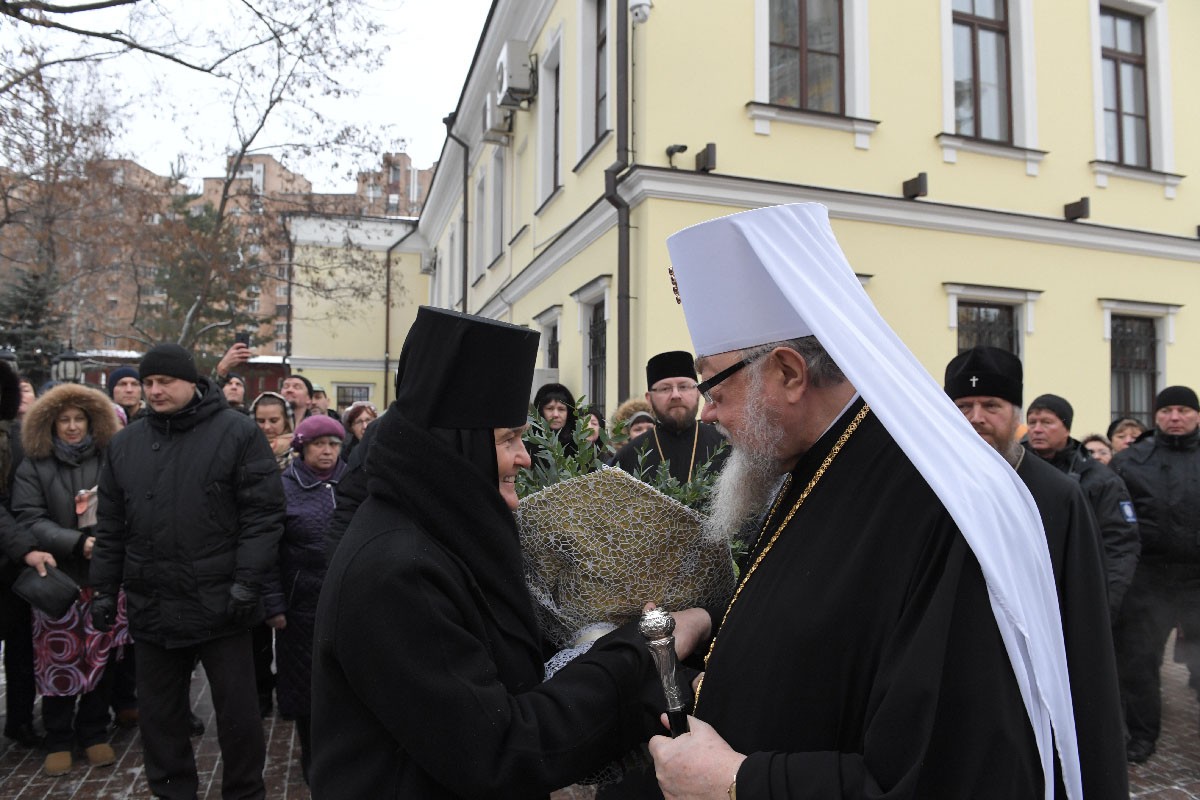 У Святых врат обители делегацию встречала настоятельница Покровского ставропигиального женского монастыря игумения Феофания (Мискина) с сестрами.