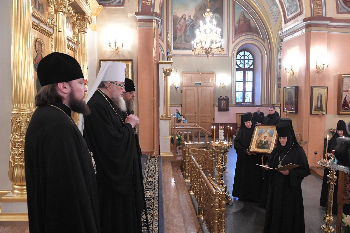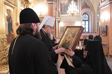 Затем игумения Феофания в дар Митрополиту Савве преподнесла икону святой праведной блаженной Матроны Московской, памятные подарки и четки.
