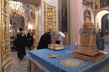 Гости проследовали в храм Покрова Пресвятой Богородицы, где поклонились мощам святой праведной блаженной Матроны Московской и прочитали молитву святой.
