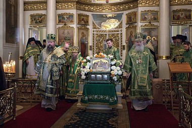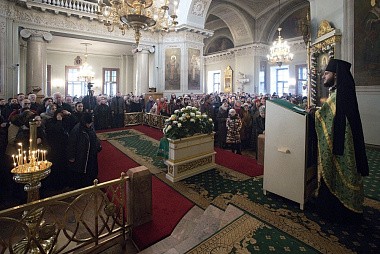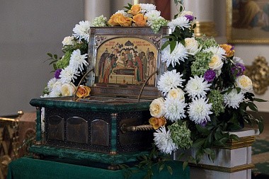 Затем было совершено славление празднуемому святому перед ковчегом с частицей его честных мощей и митрополит Дионисий прочитал молитву благоверному князю Даниилу Московскому.