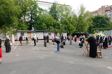 При подготовке богослужений были учтены все предписанные священноначалием санитарные меры. На землю была нанесена специальная разметка, установлены громкоговорители, часть двора, отведенная для проведения исповеди, была дополнительно огорожена. На видных местах были размещены плакаты с пояснениями относительно имеющихся санитарных требований.
