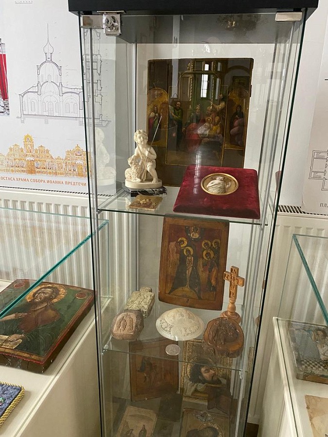 Частью краеведческой работы на подворье стал музей, который открыт в соборном храме. Появился он после реставрации храма, во время которой были найдены старинные кресты, монеты и другие артефакты. Например, были обнаружены монеты, датируемые ХIV веком. Иеромонах Сергий решил не хранить находки в коробках, а выставить на витрину, чтобы их могли увидеть паломники и прихожане. В экспозиции музея есть и старинные иконы, которые не подлежат реставрации, старые книги, колокола, пушечные ядра времен Отечественной войны 1812 года. Отдельная витрина посвящена святому Иоанну Предтече, в честь которого назван храм. Она рассказывает о жизненном пути святого – от рождения до кончины, а также о чудесах, связанных с его мощами. Коллекция все время пополняется и сейчас составляет более ста предметов. В витринах паломникам показывают только малую ее часть.