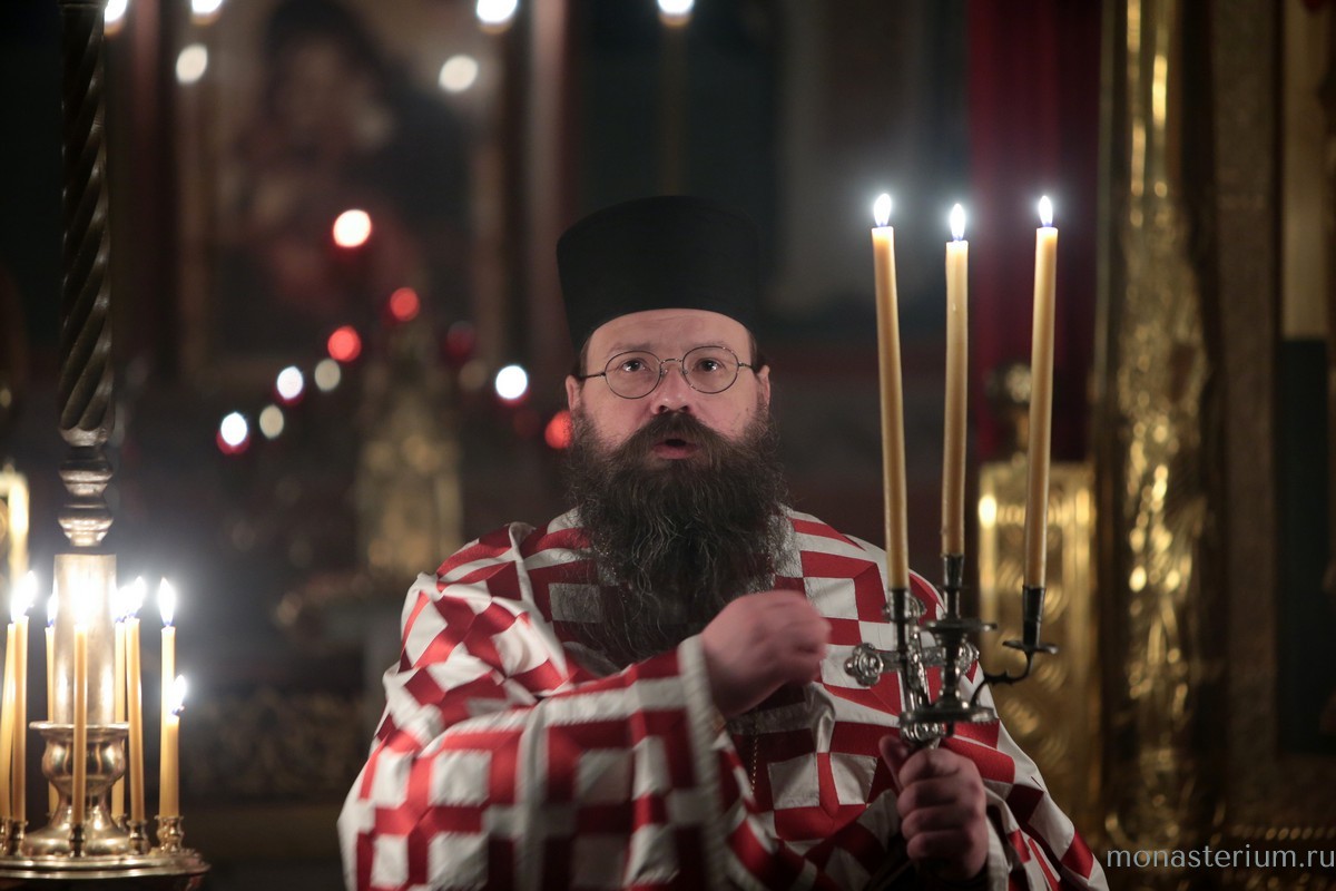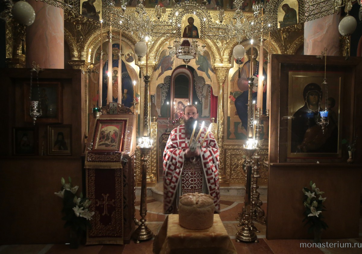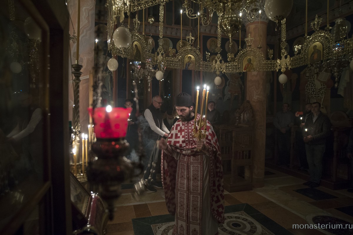 Праздничное богослужение в монастырском храме Святителя Спиридона Тримифунтского началось полунощницей перед Плащаницей Господа Бога и Спаса нашего Иисуса Христа.