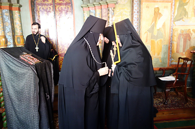 По традиции, пострижение совершалось на месте погребения основательницы обители схимонахини Марфы (+1389) в северном приделе собора Рождества Пресвятой Богородицы, посвященном Сошествию Святого Духа на апостолов.