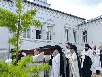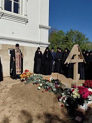 Архимандрит Поликарп похоронен за алтарем Троицкого храма с южной стороны; с северной стороны алтаря находятся могилы священников, служивших в обители до революции.