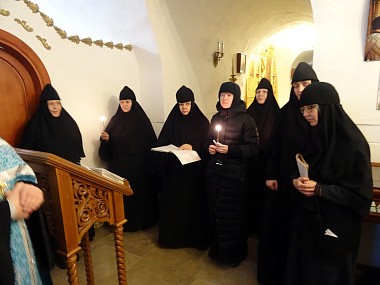После трапезы, за которой чередная сестра читала жизнеописание старицы Досифеи, составленное протоиереем Василием Рудневым, несколько сестер и экскурсоводы из Досифеевской группы поехали в Новоспасский ставропигиальный мужской монастырь почтить память Ивановской затворницы.