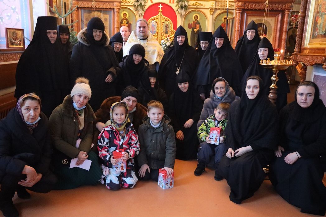 За совместной трапезой насельницы обители и сестры подворья поздравили друг друга с праздником исполнением праздничных песнопений и колядок, в пении которых участвовали все присутствующие.