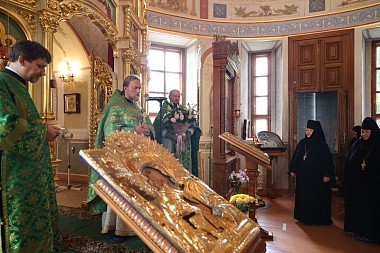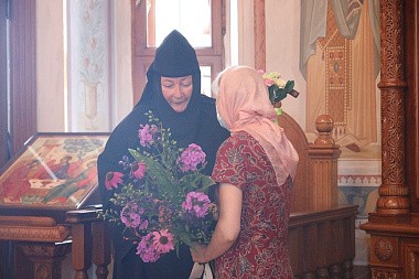 Поздравить игумению Марию прибыли настоятельница Покровского Хотькова ставропигиального монастыря игумения Олимпиада (Баранова) с сестрами и настоятельница Свято-Троицкого Александро-Невского ставропигиального монастыря с. Акатово игумения Антония (Минина).