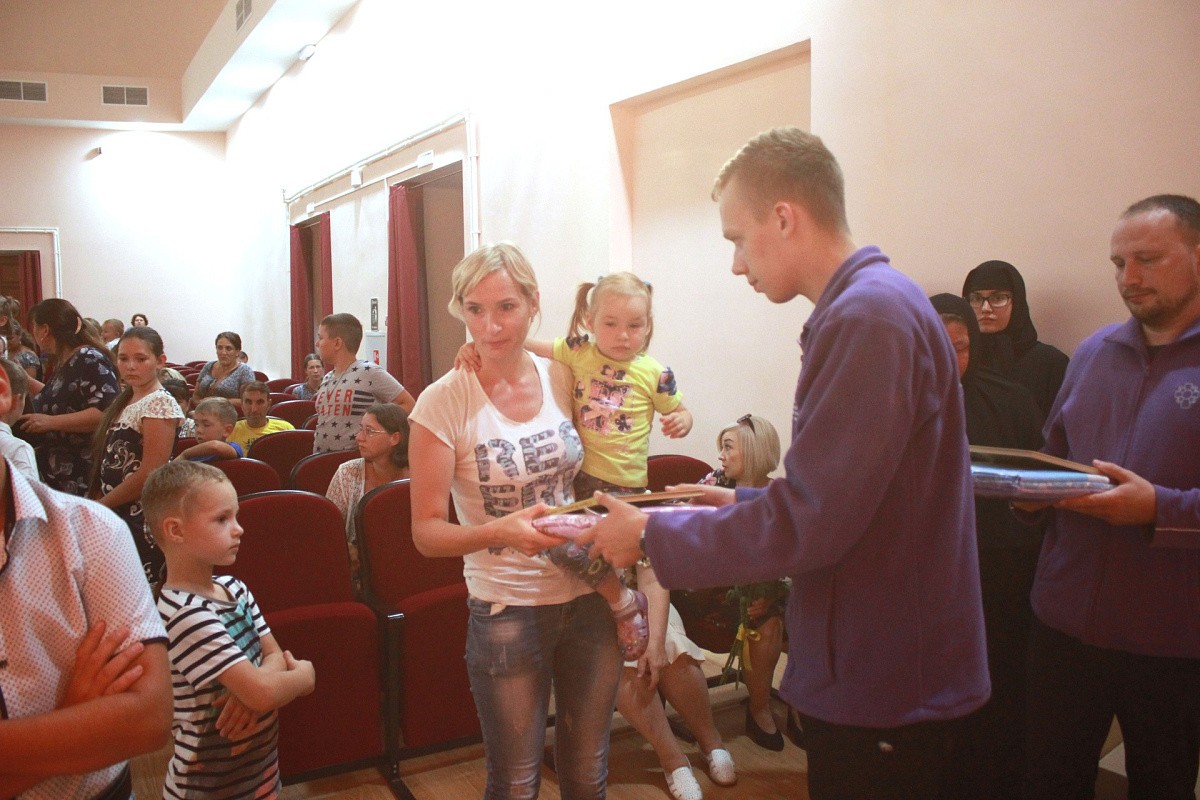 «Уважаемая Татьяна Даниловна, – обратилась матушка Екатерина к директору Центра соцобслуживания Печорского района Т.Д. Травиной, – дети, родители! В эти жаркие летние дни мы приехали к вам, чтобы поздравить вас с тем праздником, который мы отмечаем всегда летом. Праздник Крещения Руси – 28 июля. Это день памяти святого равноапостольного князя Владимира, который крестил Русь и является нашим земляком. Он родился на Псковской земле, и потому мы с вами сделали праздник, посвященный святым земли Псковской.