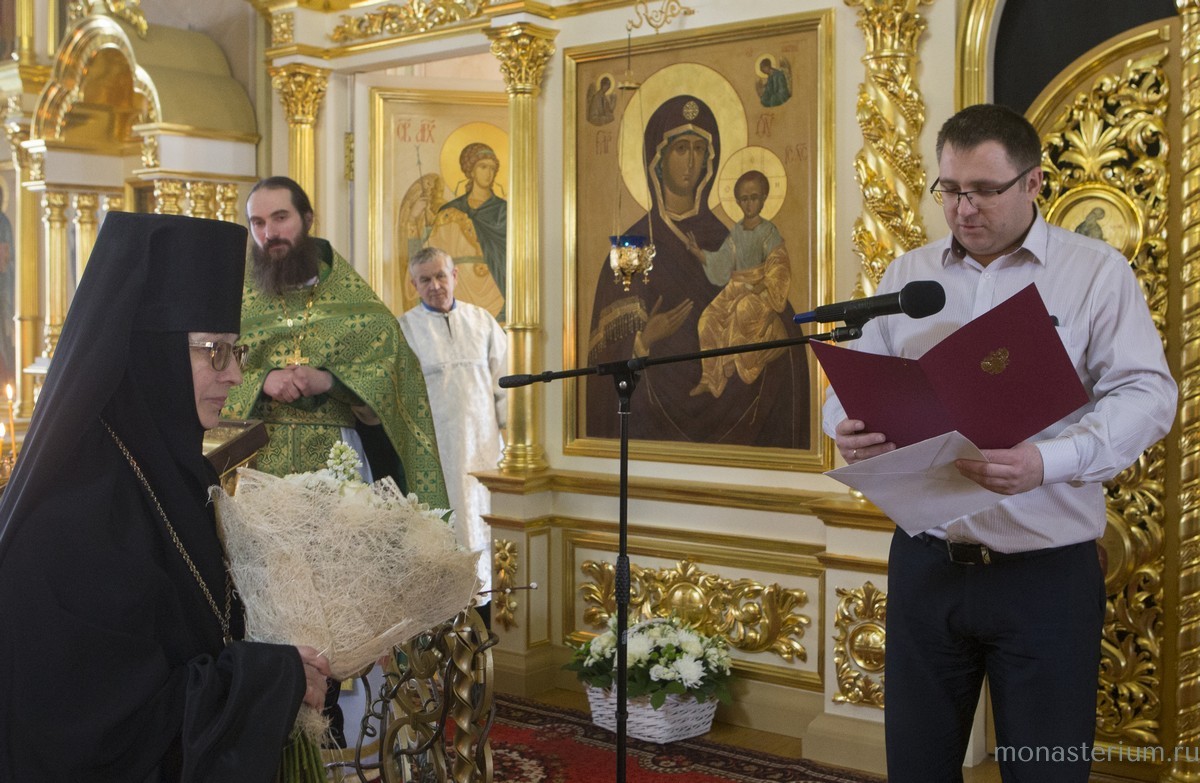 Свои поздравления юбиляру передали: действительный государственный советник I класса, директор Правового департамента Правительства РФ К.Ю. Панферов; заместитель Комитета по регламенту Государственной Думы РФ, депутат Госдумы Федерального Собрания РФ М.В. Романов; совет депутатов и Администрация поселения Новофедоровское города Москвы, представители Синодального отдела по монастырям и монашеству, а также сестры, клир, сотрудники и многочисленные прихожане обители.