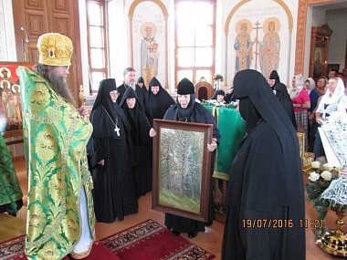 Игумения Ангелина вручила имениннице полотно, на котором изображен небольшой деревянный храм в лесу времен преподобного Сергия.