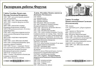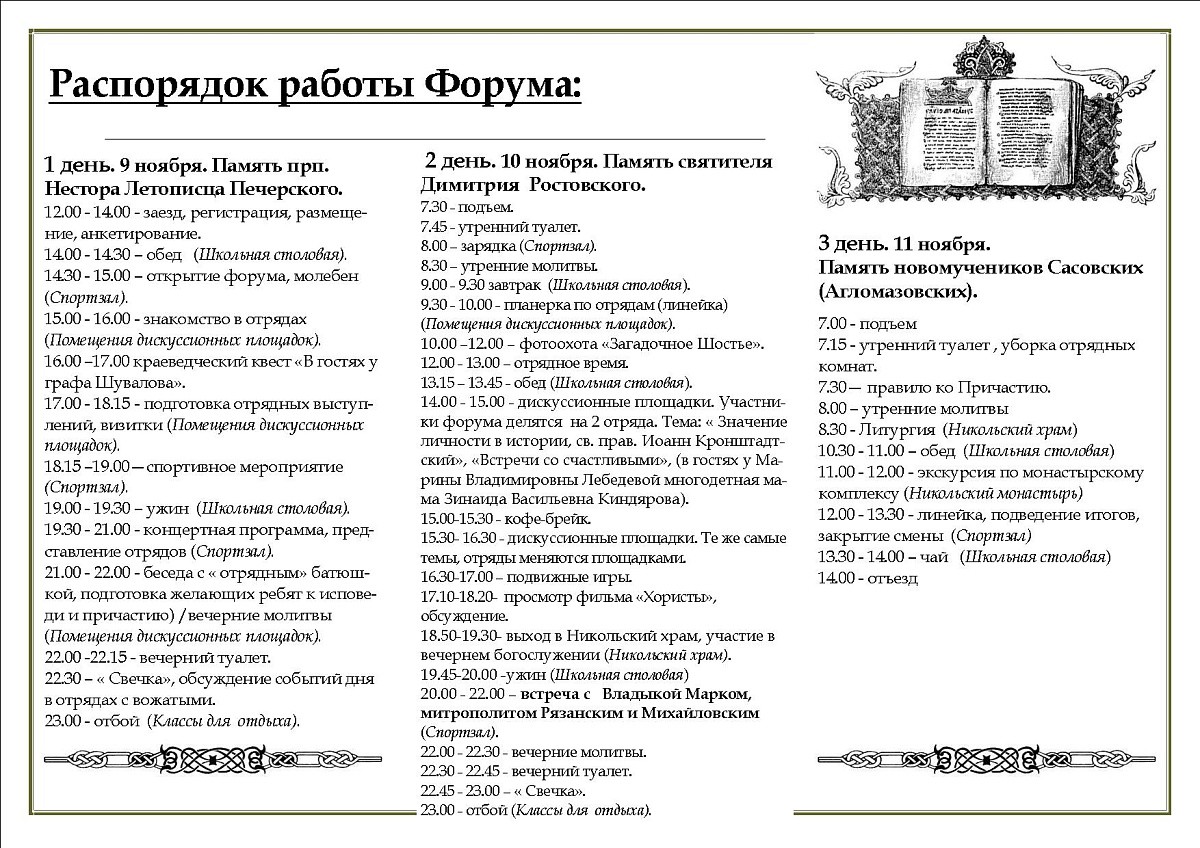 Третий день форума начался Божественной воскресной литургией в Никольском храме обители. Клирику монастыря протоиерею Владимиру Постникову сослужили священники Рязанской епархии, участники форума. За богослужением подростки приступали к таинствам Исповеди и Святого Причащения. После обеда для всех участников форума были проведены экскурсии по Никольскому Шостьенскому ставропигиальному женскому монастырю.