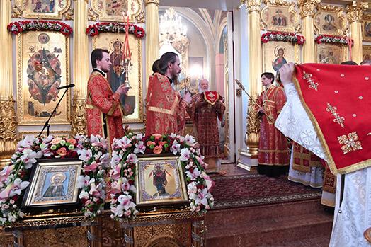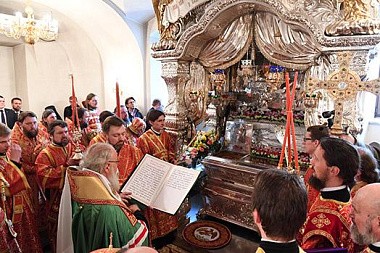 По прибытии в монастырь Святейший Патриарх Кирилл поклонился честным мощам блаженной Матроны, почивающим в храме Покрова Пресвятой Богородицы, а затем возглавил служение Божественной литургии в храме Воскресения Словущего.
