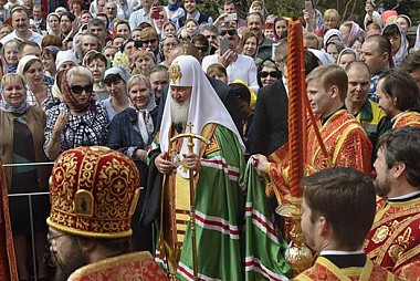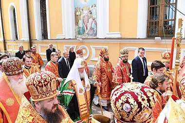 По окончании Литургии Святейший Патриарх Кирилл совершил молебен у раки с мощами блаженной старицы Матроны в Покровском храме обители и возглавил крестный ход по территории монастыря.