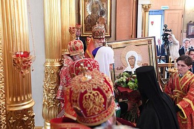 По окончании богослужения игумения Феофания (Мискина) от лица насельниц Покровского монастыря и благочестивых паломников приветствовала Святейшего Владыку и преподнесла Его Святейшеству икону святой Матроны, созданную сестрами обители в старинной технике шитья.