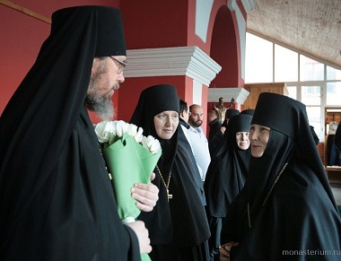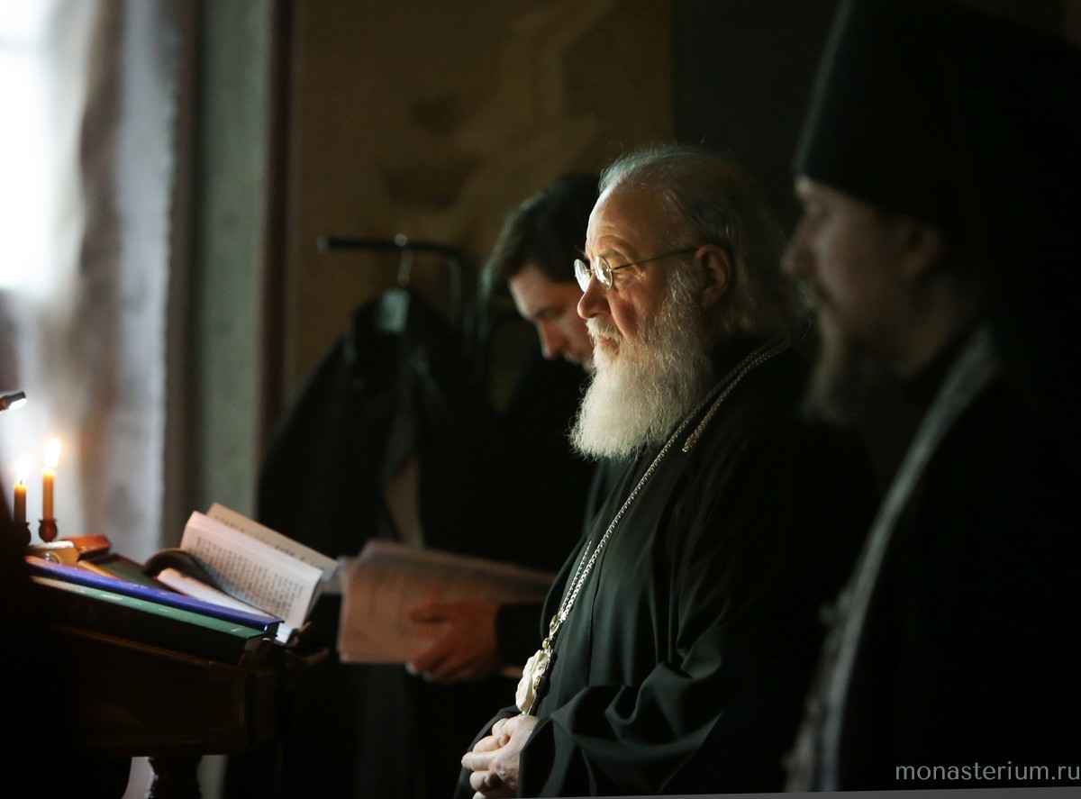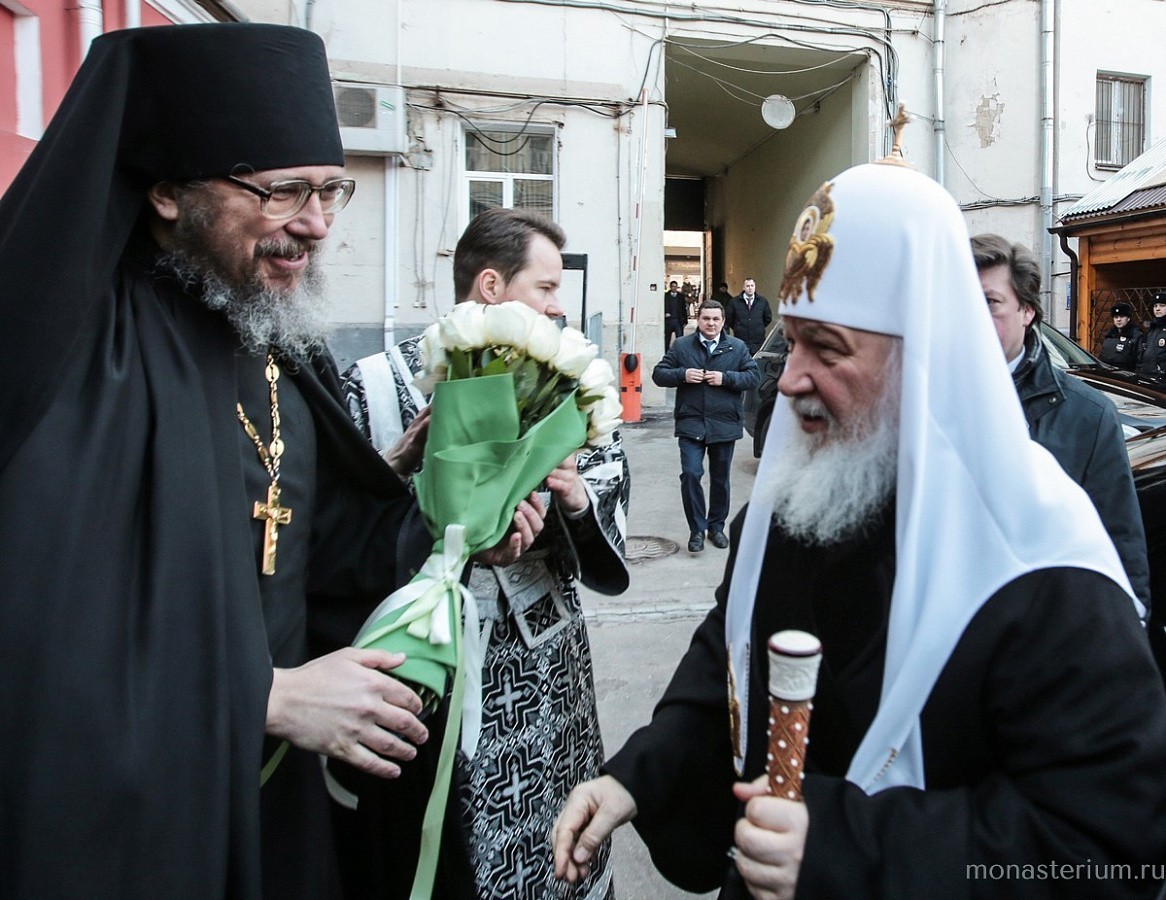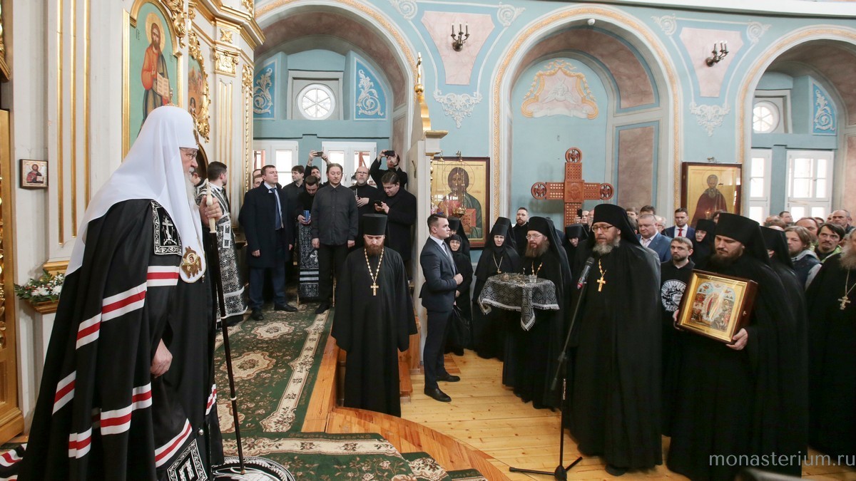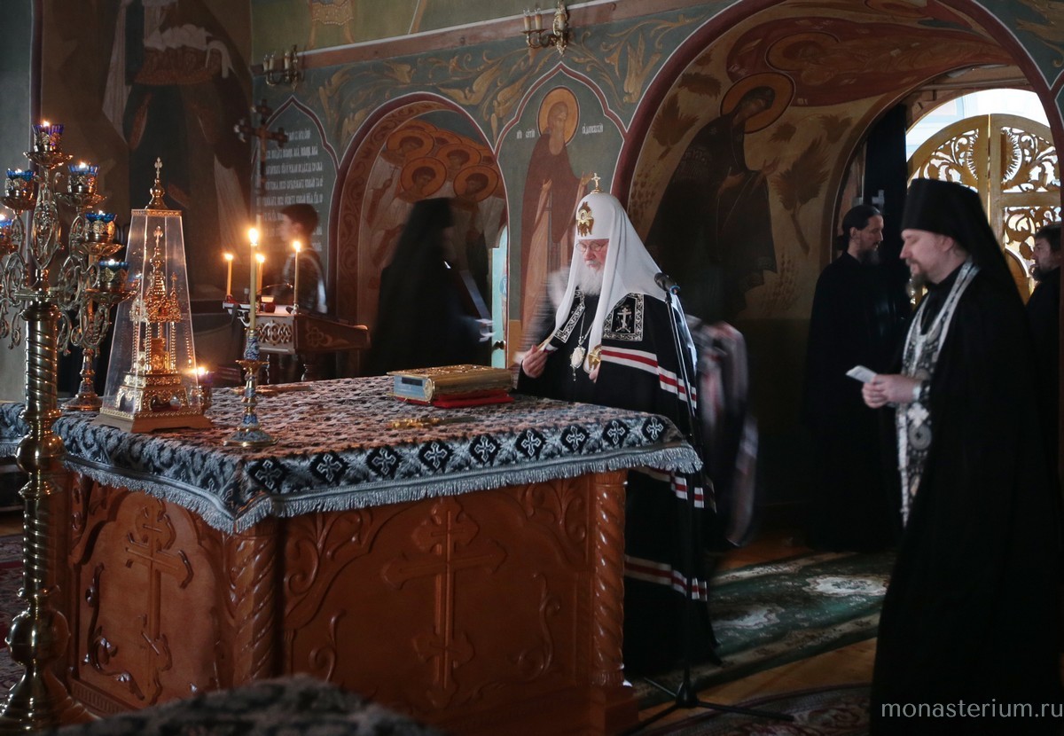 По окончании богослужения и.о. наместника монастыря иеромонах Даниил (Константинов) поздравил Святейшего Патриарха Кирилла с 43-летием архиерейской хиротонии (14 марта 1976 года архимандрит Кирилл (Гундяев) был хиротонисан во епископа Выборгского, викария Ленинградской епархии). Отец Даниил преподнес Его Святейшеству икону Божией Матери «Всех скорбящих Радость» и лампаду.