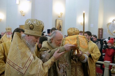Предстоятель Русской Православной Церкви совершил чин великого освящения главного храма обители – возрожденного собора Вознесения Господня – и Божественную литургию в новоосвященном соборе.