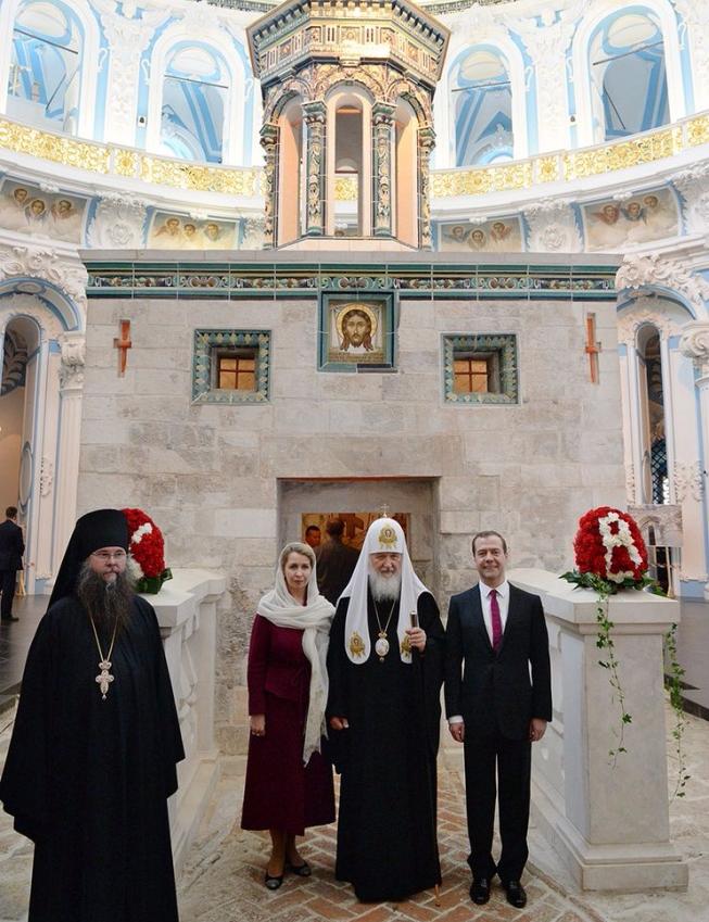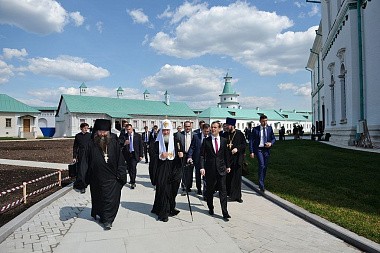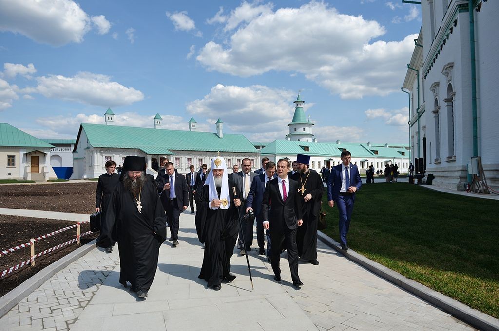 Затем Святейший Патриарх Кирилл и Д.А. Медведев в сопровождении архимандрита Феофилакта (Безукладникова) и членов Попечительского совета осмотрели Воскресенский собор и другие здания Ново-Иерусалимского монастыря.