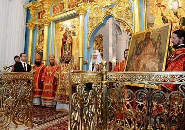 В дар новоосвященному храму Д.А. Медведев передал старинный образ Христа Вседержителя.