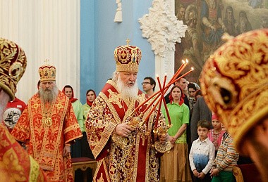 Святейший Патриарх Кирилл также поздравил собравшихся с освящением Воскресенского собора: